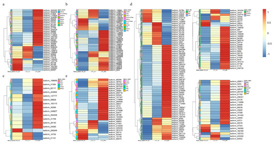 Heatmap of co-expressed DEGs related to signal transduction (a), ion homeostasis and water transport (b), reactive oxygen species production and scavenging (c), hormone response (d) and cell wall modification (e).