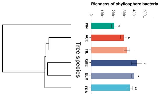 The richness of phyllosphere bacteria arranged according to tree’s phylogenetic relationships in a temperate mixed forest of Changbai Mountain. If the branches between two tree species are shorter, it signifies that they are closer in terms of evolution. Conversely, longer branches indicate a more distant genetic relationship. Letters “a”, “b”, and “c” represent distinct groups identified through ANOVA. Groups sharing the same letter signify no significant difference (p > 0.05), whereas groups with different letters indicate a significant difference (p < 0.05). Abbreviations of tree species: ACE: Acer mono; FRA: Fraxinus mandshurica; PIN: Pinus koraiensis; QUE: Quercus mongolica; TIL: Tilia amurensis; ULM: Ulmus japonica.