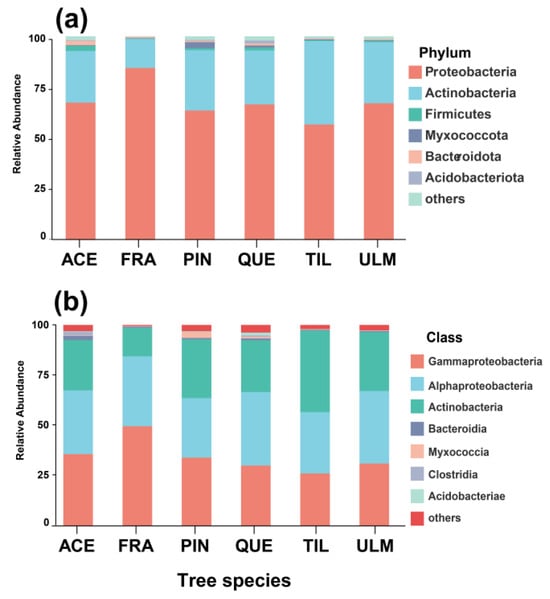 Histogram of relative abundance of phyllosphere bacteria of dominant tree species in a temperate mixed forest of Changbai Mountain at the level of phylum (a) and class (b) level. Abbreviations of tree species: ACE: Acer mono; FRA: Fraxinus mandshurica; PIN: Pinus koraiensis; QUE: Quercus mongolica; TIL: Tilia amurensis; ULM: Ulmus japonica.