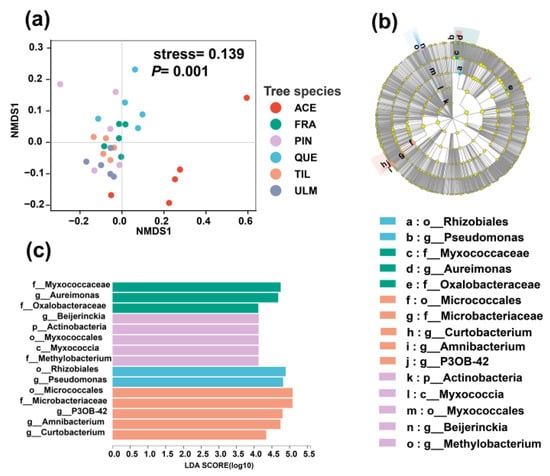 NMDS visualization diagram (a); cladogram of taxa which were differentially expressed based on Linear discriminant analysis Effect Size (LEfSe) (b); and Linear discriminant analysis (LDA) scores indicating the effect size of each differentially expressed taxon (c) of phyllosphere bacteria community structure of dominant tree species in a temperate mixed forest of Changbai Mountain. The stress value measures the goodness of fit of the NMDS solution to the original data. A lower stress value (closer to 0) indicates a better fit of the NMDS solution to the data, suggesting that the reduced-dimensional representation preserves the underlying structure of the original data. Abbreviations of tree species: ACE: Acer mono; FRA: Fraxinus mandshurica; PIN: Pinus koraiensis; QUE: Quercus mongolica; TIL: Tilia amurensis; ULM: Ulmus japonica.