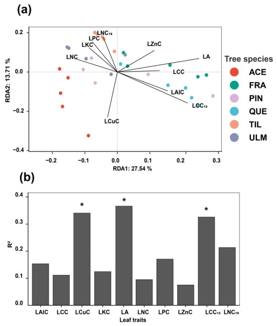 Redundancy analysis result (RDA) of phyllosphere bacterial community and leaf functional traits (a); and the explanatory power of each predictive factor (b). See Table 3 for the symbolic meanings of each factor in the figure; The asterisk (*) in the figure indicates that the factor has a significant influence on the microbial community (p < 0.05). Abbreviations of tree species: ACE: Acer mono; FRA: Fraxinus mandshurica; PIN: Pinus koraiensis; QUE: Quercus mongolica; TIL: Tilia amurensis; ULM: Ulmus japonica.