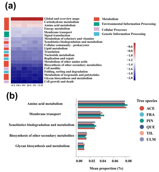 For the analysis of bacterial functions, the functions related to metabolism were the richest in our dataset, accounting for 76% of all functional annotation sequences (Figure 4a). The main metabolic processes were amino acid metabolism (9.1%), carbohydrate metabolism (8.4%), and energy metabolism (4.2%). Environmental and genetic information processing also had a high relative abundance, mainly membrane transport (3.9%), signal transduction (3.1%), and translation (2.1%) (Figure 5a). The variance test among tree species with secondary functions showed that there were significant differences in relative abundance among tree species with six metabolic processes including amino acid metabolism, membrane transport, xenobiotics biodegradation and metabolism, biosynthesis of other secondary metabolites, and glycan biosynthesis and metabolism. P. koraiensis’s amino acid metabolism and membrane transport were significantly higher than other tree species (Figure 5b).