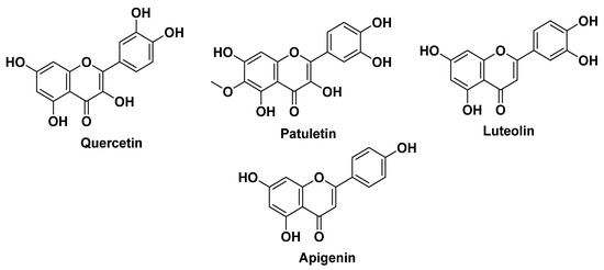Roman chamomile (Chamaemelum nobile, Asteraceae) finds extensive application in traditional medicine globally, with a notable presence in Algeria, particularly in the Northeastern region. Chamaemelum nobile is renowned for its tranquilizing properties, serving as a mild sedative to alleviate nervousness, anxiety, and a range of disorders. It has been historically employed to address conditions, such as hysteria, insomnia, and various ailments, earning its place as one of the oldest known medicinal herbs [34]. Flavonoids, including apigenin, luteolin, quercetin, and patuletin, constitute significant components in Chamaemelum nobile (Figure 5). Interestingly, these flavonoids are not exclusive to Roman chamomile; they are also present in other plants, like Passiflora incarnata (passionflower) and Matricaria chamomilla (chamomile) [31,62]. Apigenin has garnered attention due to its reported binding affinity to gamma-aminobutyric acid (GABA)-benzodiazepine receptors in the brain. This interaction with GABA receptors may be responsible for the sedative effects associated with apigenin [148]. Such insights into the specific bioactive compounds in Chamaemelum nobile contribute to our understanding of its potential pharmacological properties and its historical use as a natural remedy for calming and soothing effects [149].