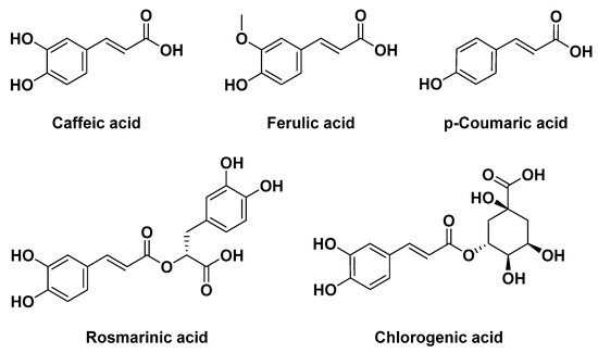 The chemical composition of Melissa officinalis includes flavonoids, phenolic compounds, and terpenoids [166]. Notably, essential oils and phenolic acids, such as caffeic, ferulic, chlorogenic, rosmarinic, and p-coumaric acids, are believed to be the primary bioactive constituents, acting synergistically to impart its medicinal properties (Figure 7).