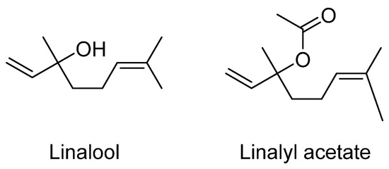 The local anesthetic effect of lavender oil and its major constituents, linalool and linalyl acetate (see Figure 9), has been reported in both in vivo and in vitro studies. An investigation of the effects of inhaled linalool on anxiety, aggressiveness, and social interaction in mice showed anxiolytic properties in the light/dark test, increased social interaction, and decreased aggressive behavior [195]. The anxiolytic effects of linalool odor were examined using the light/dark box test and the elevated plus maze (EPM). It was found that linalool odor has an anxiolytic effect without motor impairment in mice. Moreover, the effect was antagonized by flumazenil, indicating that the linalool odor-induced anxiolytic effect was mediated by γ-aminobutyric acid GABAergic transmission via benzodiazepine (BDZ)-responsive GABAA receptors [196]. These results provide information about the potential central neuronal mechanisms underlying the odor-induced anxiolytic effects and lay the foundation for exploring the clinical application of linalool odor in anxiety treatments [196].