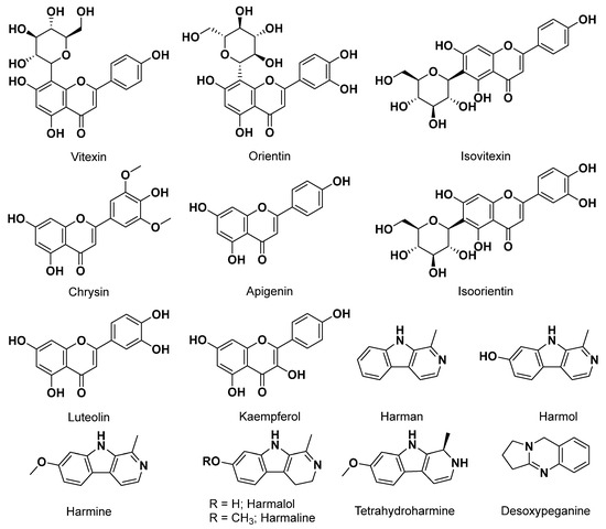 Passiflora genus (Passifloraceae) includes perennial plants found largely endemically on the America’s (North, Central, and South Americas) [212]. They are mostly distributed in the warm, temperate, and tropical regions of the world. The Passiflora genus is another example of using plants for the treatment of insomnia, anxiety, and various other disorders of the CNS since antiquity; in fact, several Passiflora species have been documented for their use in the North/Central America Mayan empire [213]. Passiflora genus have been propagated and can been found in the tropical and subtropical areas in the world, and indeed in Algeria these species are usually planted in gardens and pergolas, but some are reported to be used in Algerian traditional medicine [72]. For example, Passiflora edulis, commonly known as passion fruit, has been used in Algerian folk medicine in the region of Skikda in northeast Algeria, is use being reported to treat hypertension and asthma, as well as a tranquilizer [214]. Passiflora edulis is a well-known crop cultivated around the world and highlighted for its nutritional and health benefits [215]. Another notable example is Passiflora incarnata, a medicinal plant used in northeast Algeria due to its effects on anxiety as a tranquilizer [72]. The potential effects of this species for treating some diseases, including opiate withdrawal, insomnia, attention-deficit disorder, and epilepsy, have also been widely reported [216,217,218,219,220]. Those two plants, and in general all Passiflora species, are a good source of flavonoids, particularly rich in C-glycoside flavones, such as vitexin, isovitexin, orientin, and isoorientin; flavones, such as apigenin, chrysin, and luteolin; and flavonols, including kaempferol and quercetin [221]. This species of β-carbolines alkaloids also includes harman, harmol, harmine, harmalol, and harmaline [222,223]. The overall effect of these plants has been ruled as being synergistic, however some of the compounds mentioned above have been studied, particularly to treat CNS disorders [223,224]. Figure 11 shows a series of bioactive compounds isolated from the Passiflora species.