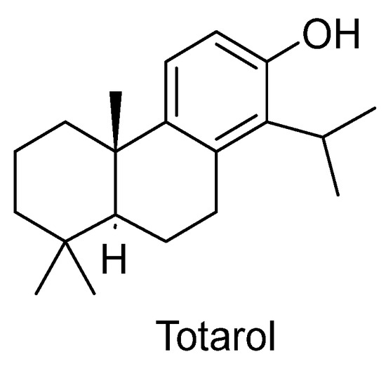 A study conducted by Gao et al. [247] revealed the vascular protective effects of totarol (Figure 14), a tricyclic phenolic diterpene abundantly present in various Juniperus species [248]. The study demonstrated that totarol activated the protein kinase B/heme oxygenase-1 (PKB/HO-1) pathway, leading to increased levels of superoxide dismutase (SOD) and the antioxidant glutathione (GSH). This, in turn, suppressed ischemia-induced brain injury. To simulate the conditions of patients with acute strokes, rats were administered totarol post-ischemia at doses of 1 and 10 µg/kg. The results revealed a significant reduction in the infarct volume compared to the untreated group. Furthermore, totarol treatment at both 1 and 10 µg/kg significantly enhanced the ischemia-induced response [247].