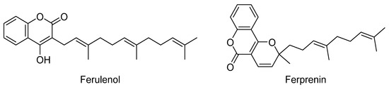- Louvet, M.-S.; Gault, G.; Lefebvre, S.; Popowycz, F.; Boulven, M.; Besse, S.; Benoit, E.; Lattard, V.; Grancher, D. Comparative inhibitory effect of prenylated coumarins, ferulenol and ferprenin, contained in the ‘poisonous chemotype’of Ferula communis on mammal liver microsomal VKORC1 activity. Phytochemistry 2015, 118, 124–130. [Google Scholar] [CrossRef]