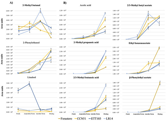 The formation of these compounds could be explained by the conversion of alcohols into other organic compounds such as lactic and acetic acids due to the growth and activity of the corresponding bacteria (lactic and acetic) [21], justifying the observed increase in the acid family and decrease in alcohols. This tendency for the acid content to increase was consistent with the individual off-odor key marker acetic and 2-methyl propanoic acids (Table 1). Acetic acid is an important odor-active compound formed in fermented beans, giving a vinegar and sour-like aroma. This compound was formed through the biochemical synthesis of ethanol oxidation during the first stage of fermentation [11], but the concentration considerably increased (20-fold) after the drying step compared to the level at the beginning of fermentation (Table 1, Figure 1B). The compounds 2-methyl propanoic acid (isobutyric acid, with rancid, buttery, cheesy and hammy notes [16]), and 3-methyl butanoic acid (sweaty aroma) could have formed (or increased in concentration) due to the aerobic putrefactive bacteria from leucine (Leu) and valine (Val), respectively [32]. In the present study, its formation started during the anaerobic phase, but as expected, their concentration in the aerobic phase stood out, with the highest contents in the dried samples (Table 1).