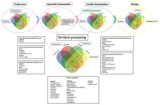 In order to find an overview of the results obtained during the traditional on-farm processing in an easier way, Venn diagrams and PCA were constructed showing the distribution of volatile compounds according to the varietal source in the different stages of on-farm or primary processing.