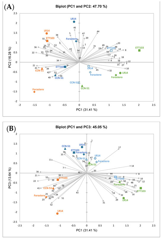 Score and loading biplots from the principal component analysis of PC1 and PC2 (A) and PC1 and PC3 (B) of the volatile profile (Table S1) obtained from the fresh (green) Ecuadorian bulk (Forastero (rhombus), CCN-51 (triangle)), fine-flavor (ETT103 (square), LR14 (circle)) cocoa and samples submitted to primary processing (anaerobic (light blue) and aerobic (dark blue) fermentation and drying (orange)).