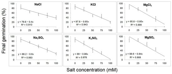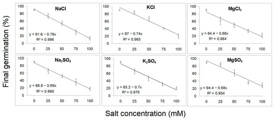 Linear regression analysis of final germination percentages of B. hirsuta seeds treated with different concentrations of chloride and sulfate salts.