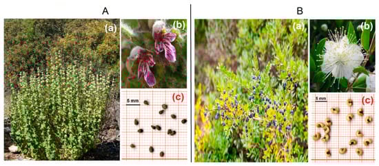 (A) Plant of Ballota hirsuta (a), flower (b) and seeds (c); (B) plant of Myrtus communis (a), flower (b) and seeds (c).