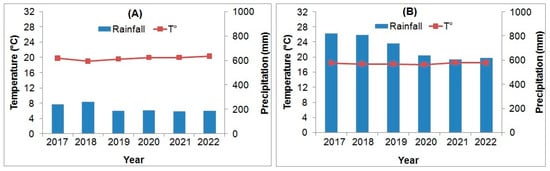 Last six-year climatic data (annual precipitations and mean temperatures) of Sidi Bel Abbes (A) and Béjaia (B) provinces (Source—Algerian National Meteorological office).
