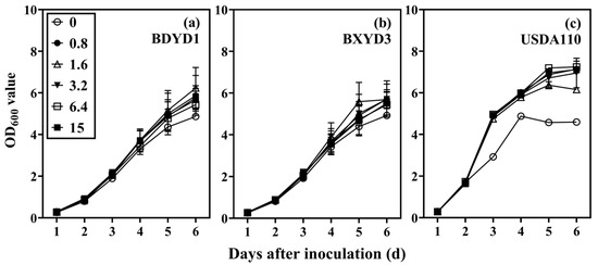 The reproduction of BDYD1 rhizobia (a), BXYD3 rhizobia (b), and USDA110 rhizobia (c) was studied under various sulfur concentrations. The data presented in the figure represent the average of four replicates. The values shown in the figure represent the optical density (OD) measurements taken after continuously culturing each strain for 6 days.