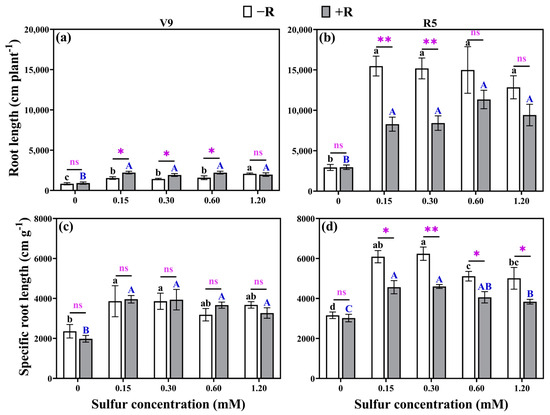 Root lengths at the V9 stage (a) and R5 stage (b), as well as specific root lengths at the V9 stage (c) and R5 stage (d), were measured for both uninoculated rhizobium and rhizobium-inoculated treatments under various sulfur concentrations. (−R) no rhizobia inoculation and (+R) rhizobia inoculation. The same lowercase letters indicate that the different sulfur concentration treatments without rhizobia inoculation showed no significant differences (p > 0.05). The same capital letters indicate that the different sulfur concentration treatments with rhizobia inoculation showed no significant differences (p > 0.05). The asterisks (*, **) denote a significant difference between uninoculated and inoculated rhizobia at the same sulfur concentration; * indicates p < 0.05, ** indicates p < 0.01, and “ns” indicates no significant difference (p > 0.05) between uninoculated and inoculated rhizobia at the same sulfur concentration. Root length (RL) refers to the total length of all the roots of the plant. Specific root length (SRL) refers to the ratio of root length to root dry weight.