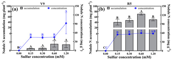 At the V9 stage (a) and R5 stage (b), after rhizobial inoculation, nodule nitrogen accumulation and nodule nitrogen concentration under various sulfur concentration treatments were examined. If different sulfur concentration treatments inoculated with rhizobia were not significantly different (p > 0.05), they are denoted by identical capital letters of the same color.