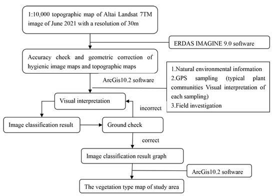 We drew the vegetation map with 3S technology [31,32]. The specific process is as follows: The vegetation map was based on the topographic map of 1:10,000 in the Aletai region of Xinjiang and the Landsat 7TM image of the Altai region with a resolution of 30 m in June 2021. The topographic map of 1:10,000 in the study area was geometrically corrected with the software ERDAS IMAGINE (version 9.0), and the satellite imagery was corrected using the corrected 1:10,000 topographic map. The vegetation distribution data (including natural environment data, field sample field surveys, GPS sample surveys, and vegetation distribution literature data) were vectorized using the ArcGIS software (version 10.2). The GPS sample, topographic map, and satellite image map were superimposed by ArcGIS software to mark the spot attributes. According to the main basis of ground-landscape type discrimination, the remote sensing satellite imagery was visually interpreted and mapped (Figure 3). Finally, through ground verification, the original image of the visual interpretation was modified several times, and the vegetation map was completed.