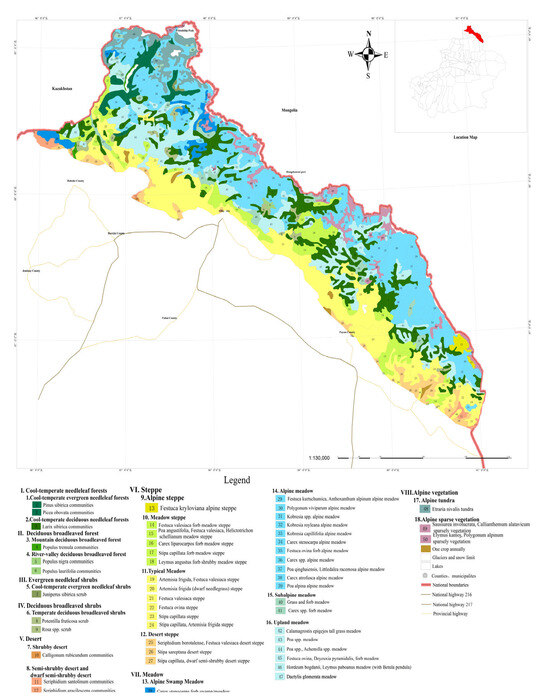 Significant differences in topography, local microclimate, hydrothermal conditions, and soil content provide suitable conditions for the development and maintenance of multiple vegetation types in the Xinjiang Altai subrange [35]. This climatic variability is due to the influences of the cold and humid airflows from the Arctic and Atlantic Oceans, the Siberian–Mongolian high-pressure dry anticyclone system, and the variability in landform types [36,37]. The types of vegetation found in the Xinjiang Altai subrange can be divided into eight main types, eighteen subtypes, and 50 formations/communities. Many types of vegetation had obvious zonal characteristics. Cold-temperate coniferous forests constitute the largest part of the total vegetation present; meanwhile, both grassland and meadow vegetation were also widely developed in the Xinjiang Altai subrange. The Calligonum rubicundum, Seriphidium borotalens, and Festuca valesiaca desert steppe communities were present only in the Xinjiang Altai subrange, and they represent a special type of abundant vegetation in the whole Altai Mountains.
