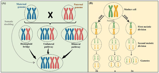 From a cytological perspective, depending on the meiotic stage at which the restitution event occurs, two distinct processes can give rise to the production of unreduced reproductive cells (i.e., the first division restitution (FDR) and the second division restitution (SDR)) (Figure 1) [18]. The FDR encompasses errors that occur during meiosis I. These errors can stem from the failure of homologous chromosomes to segregate correctly during anaphase I and/or the lack of chromosome pairing during the zygotene/pachytene stage (Figure 1B) [21]. Within the SDR process, chromosome pairing and division proceed typically during meiosis I, but an anomaly arises in anaphase II where sister chromatids fail to segregate as expected [22] (Figure 1B). These irregularities facilitate the restoration of the somatic chromosome number within the gametes, leading to the formation of dyads or triads [18]. The genetic outcomes related to the maintenance of heterozygosity vary between each meiotic restitution mechanism [18]. Unreduced gametes produced via the FDR typically contain two non-sister chromatids and may maintain a level of heterozygosity similar to that of their parent cells [21]. In contrast, unreduced gametes resulting from SDR contain two sister chromatids, leading to a lower heterozygosity level compared to their parent cells [22]. The disparity in heterozygosity levels plays a pivotal role in influencing the potential success or failure of a recently formed polyploid, whether within wild populations or in the context of plant breeding [18].