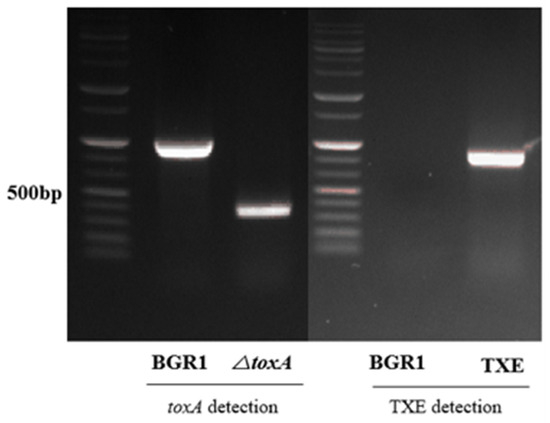 To evaluate whether the metagenome-derived toxoflavin-degrading enzyme TxeA actually maintains the functional ability to degrade toxoflavin in B. glumae BGR1 in vivo, its corresponding gene, txeA, was introduced into B. glumae BGR1 by conjugation. B. glumae BGR1, carrying the externally introduced txeA, was selected from kanamycin-containing media and confirmed by PCR. Mutant strains in which txeA was introduced externally, called TXE, were generated (Figure 1). The toxA marker-less mutant strain was constructed as a marker-less deletion mutant targeting the toxA gene bglu_2g06400 via two homologous recombination events. After the completion of the second recombination, the toxA deletion mutant strain was confirmed by PCR (Figure 1). A single deletion mutant, called ΔtoxA, corresponding to the toxA gene, was generated. ΔtoxA was used to determine phenotypic comparisons related to toxoflavin production in TXE.