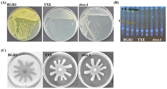 The biggest characteristic of the toxoflavin produced by B. glumae BGR1 is that it has a yellow pigment that can be seen with the naked eye. After three days of culture of B. glumae BGR1 and mutant strains, the agar plates, including the peripheries of the colonies, were stained yellow because of the toxoflavin yellow pigment. Only B. glumae BGR1 exhibited the strongest yellow coloration (Figure 2A). In TXE, like in ΔtoxA, observable yellow pigment caused by toxoflavin was not observed on agar plates (Figure 2A). Based on previous studies, toxoflavins were detected by analyzing the compounds secreted by B. glumae BGR1 and other mutant strains using thin-layer chromatography [5,7,17]. Toxoflavin was detected only in B. glumae BGR1 under UV light at 365 nm. The toxoflavin-positive band in B. glumae BGR1 was not detected in other mutant strains containing ΔtoxA and TXE (Figure 2B). As a result, ΔtoxA and TXE indicate that they do not produce toxoflavin according to both simple visual inspection and UV light examination. These results also suggest that the introduced foreign gene encoding TxeA into B. glumae BGR1 was expressed and functional in B. glumae BGR1 in vivo. Bacterial motility was observed in all strains. None of the strains, including the txeA-expressing strain, showed motility defects (Figure 2C). In other words, no apparent difference in swarming motility was observed between the mutant strains and B. glumae BGR1; that is, comparable swarming motility was observed in all strains, as assessed by the formation of dendritic patterns.