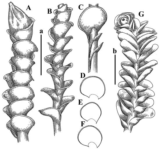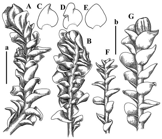 Haplozia tuberculifera Herzog, Holotypus, JE–04009127: (A) perianthous plant; (B) plant habit; (C–E) leaves. Jungermannia abyssinica Nees, Holotypus, STR, s.n.: (F) plant habit; (G) perianthous plant. Scales: a—2 mm for (A–E); b—2 mm for (F,G).
