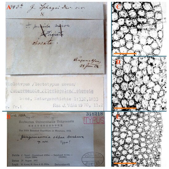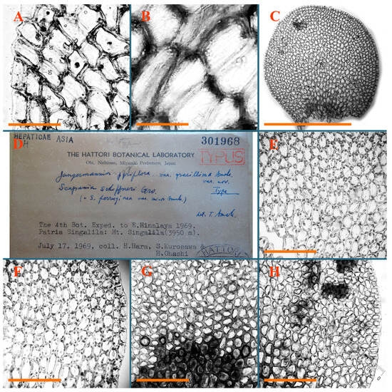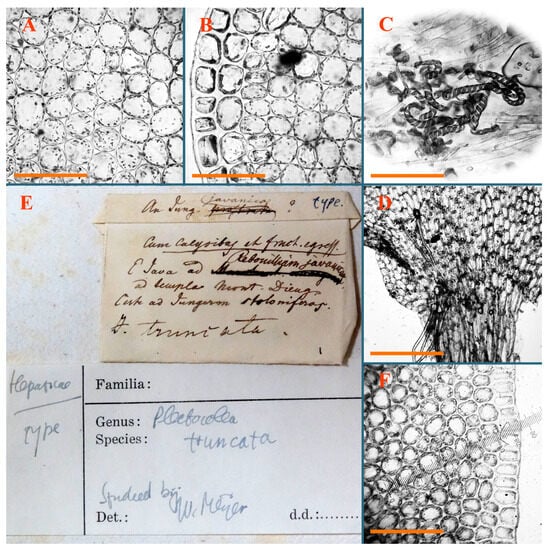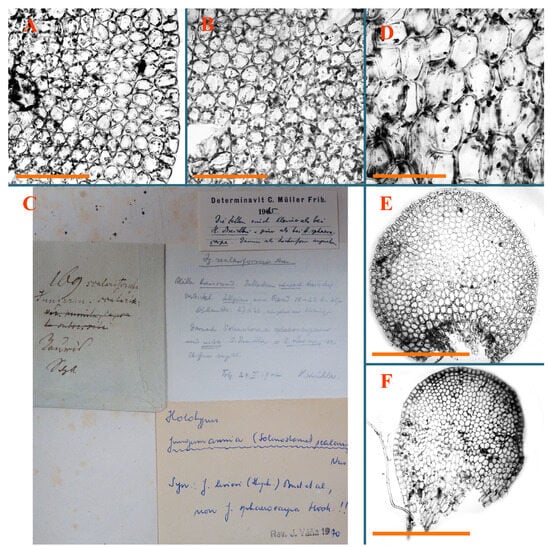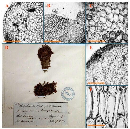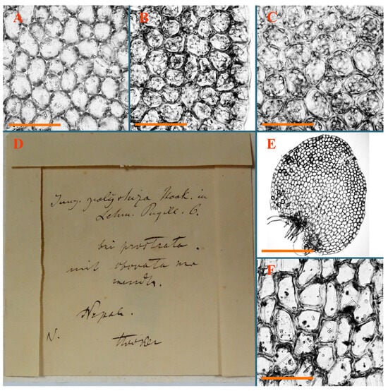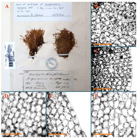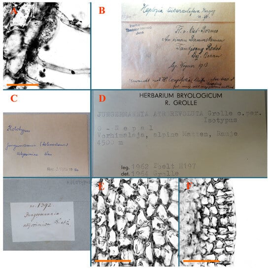 Haplozia tuberculifera Herzog, Holotypus, JE–04009127: (A) leaf margin cells; (B) holotype label). Jungermannia abyssinica Nees, Holotypus, STR, s.n.: (C) holotype label. Jungermannia atrorevoluta Grolle ex Amakawa, Isotypus, HIRO, s.n.: (D) isotype label; (E) midleaf cells; (F) leaf margin cells. Scales: 100 µm for (A); 50 µm for (E,F).