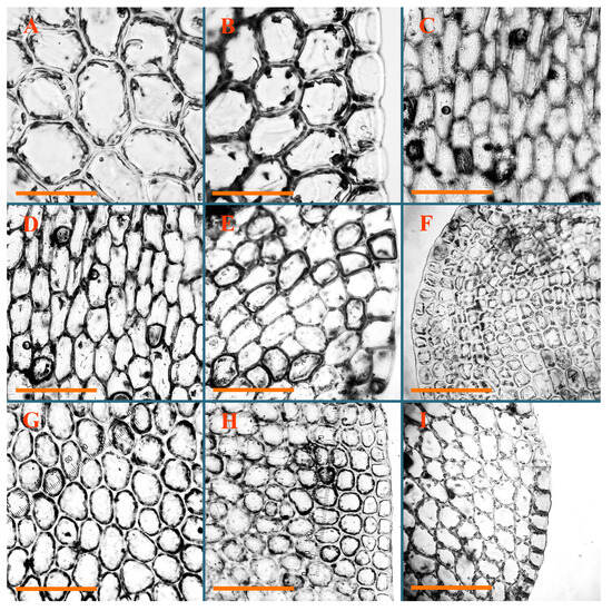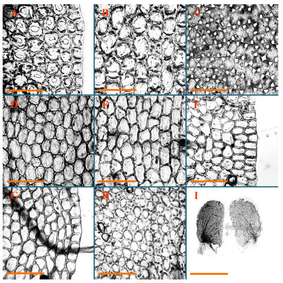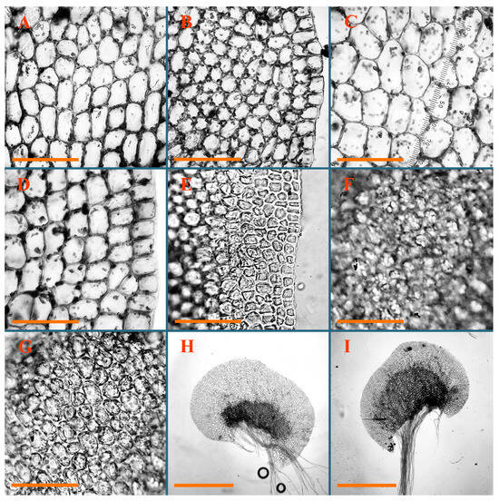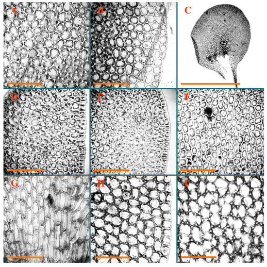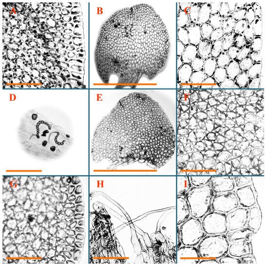 Jungermannia borneensis Amakawa Holotypus, NICH–252353: (A) leaf margin cells; (B) midleaf cells. Jungermannia caelestis Inoue et Váňa Holotypus, TNS–48164: (C) midleaf cells; (D) cells near leaf base). Jungermannia champawatensis S.N.Srivast. et Amakawa Isotypus, HIRO, s.n.: (E) midleaf cells; (F) leaf margin cells in leaf upper part; (G) leaf margin cells in leaf middle part. Jungermannia comata Nees Holotypus, STR, s.n.: (H) midleaf cells; (I) leaves. Scales: 100 µm for (A–H); 1 mm for (I).