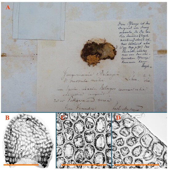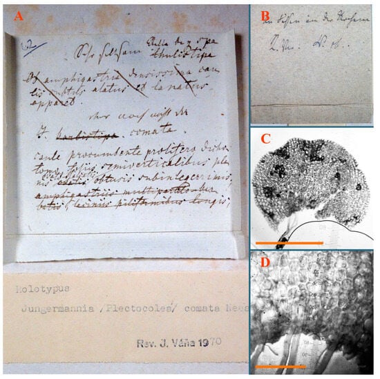 Jungermannia comata Nees Holotypus, STR, s.n.: (A) holotype label. Jungermannia confertissima Nees Holotypus, STR, s.n.: (B) holotype label; (C) leaf; (D) leaf basal cells with rhizoid initial cells. Scales: 500 µm for (C); 100 µm for (D).