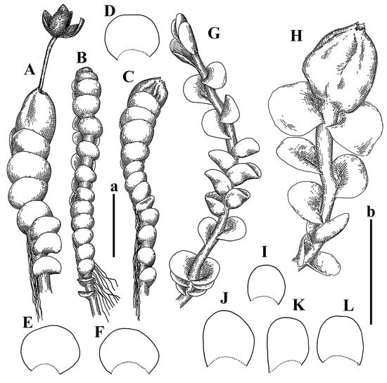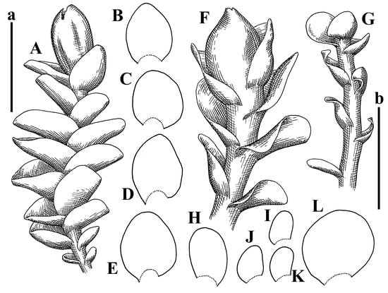 Solenostoma hiugaense Amakawa Isotypus, SAP, s.n.: (A) perianthous plant; (B–E) leaves. Solenostoma rishiriense Amakawa Holotypus, NICH–53527: (F) perianthous plant; (G) plant habit; (H–L) leaves. Scales: a—2 mm for (A–E); b—1 mm for (F–L).