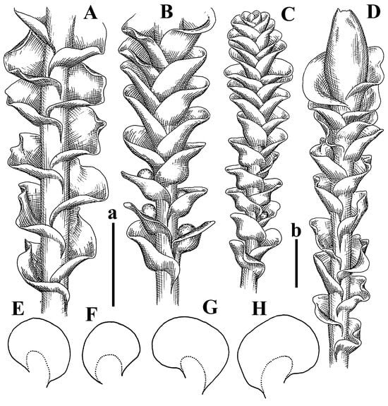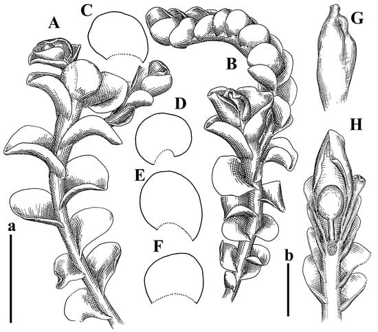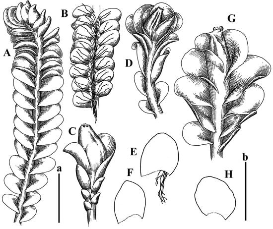 Jungermannia champawatensis S.N.Srivast. et Amakawa Isotypus, HIRO, s.n.: (A) perianthous plant; (B–D) leaves. Jungermannia comata Nees Holotypus, STR, s.n.: (E) female plant habit; (F) plant habit ventral view; (G,H) leaves. Scales: a—2 mm for (A–D); b—2 mm for (E–H).