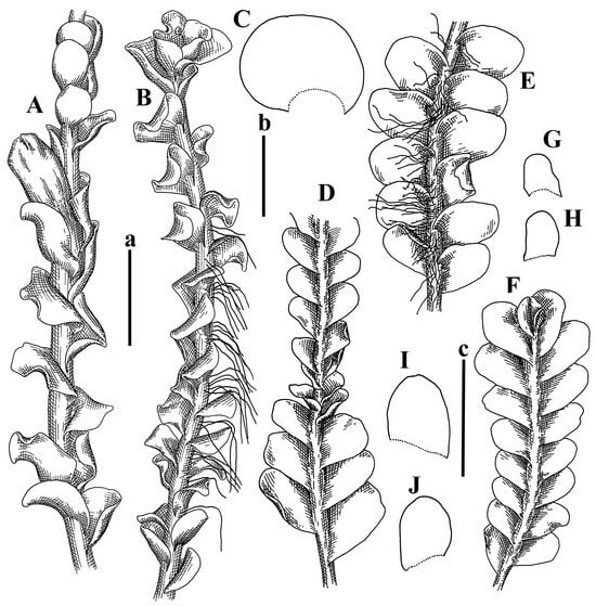 Alicularia haskarliana Nees Holotypus, STR, s.n.: (A) male plant; (B) perianthous plant; (C–E) leaves. Aplozia stephanii Schiffn. Lectotypus, G00120794: (F) perianthous plant; (G) shoot, dorsal view; (H) shoot, ventral view; (I,J) leaves. Scales: a—1 mm for (A–E); b—5 mm for (F–H); c—2 mm for (I,J).