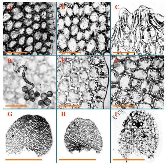 2) The specimen (Schwabe 63), although marked as a holotype, can hardly be used for the purpose of the correct identification. Another specimen (Schwabe 62, JE04000810), virtually from the same place, was probably used to compile the original type description, because in the original description, Herzog mentions a ‘setulose’ perianth mouth. Meanwhile, the material in ‘Schwabe 62′ is perianthous, contrary to perianthless ‘Schwabe 63′. Moreover, the former specimen (‘Schwabe 62′) contains well-developed plants, characterized by rigid purplish rhizoids (not totally colorless to brownish as in Schwabe 63, although not purplish (‘purpurascentibus’, as in the original source)), more robust plants, leaf cells with well-developed, moderate-in-size convex trigones, and thickened (mostly unequally, although sometimes subequally) cell walls along the leaf margin. The cuticle is slightly papillose-verrucose along the leaf margin and virtually smooth in the midleaf (not as smooth as in the holotype). Following Article 9.9 of the International Code of Nomenclature for Algae, Fungi, and Plants, “An epitype is a specimen or illustration selected to serve as an interpretative type when the holotype, lectotype, or previously designated neotype, or all original material associated with a validly published name, is demonstrably ambiguous and cannot be critically identified for purposes of the precise application of the name to a taxon”. Therefore, we suggest proposing an epitype for the taxon using the specimen Schwabe 62, JE04000810 (Figure 50H,I, Figure 52A–D and Figure 53A–C).