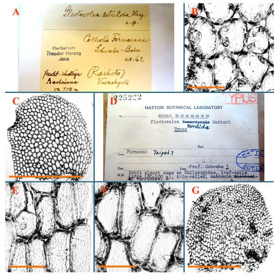 Plectocolea setulosa Herzog, Epitypus, JE04000810: (A) specimen label Schwabe62; (B) midleaf cells, (C) leaf. Plectocolea sordida Holotypus NICH–225232: (D) holotype label; (E) leaf margin cells showing papillae; (F) midleaf cells; (G) leaf. Scales: 50 µm for (B,E,F); 1 mm for (C,G).