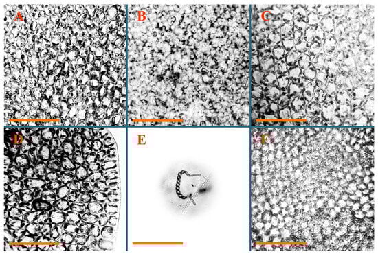 Solenostoma clavellatum Mitt. ex Steph. Lectotypus, BM s.n.: (A) midleaf cells; (B) midleaf cell cuticle showing papillae. Solenostoma hiugaense Amakawa Isotypus, SAP, s.n.: (C) midleaf cells; (D) leaf margin cells; (E) elater. Solenostoma rishiriense Amakawa Holotypus, NICH–53527: (F) midleaf cells. Scales: 100 µm for (A–F).
