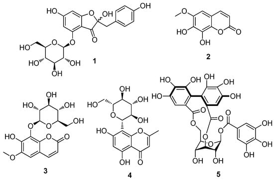 The extraction process commenced with the partitioning of J. podagrica leaf methanol (MeOH) extract between water and organic solvents (hexane, EtOAc, and n-BuOH), progressing from lower to higher polarity. This orchestrated maneuver yielded a triumvirate of fractions. Our focal point, the n-BuOH soluble fractions arising from this solvent partition, became the epicenter of LC/MS-guided chemical exploration. Through the meticulous orchestration of solvent-partitioned derivation, a symphony of chromatographic processes was conducted over Sephadex LH-20, further enriched by preparative and semi-preparative high-performance liquid chromatography (HPLC) phases. The culmination of these strategic steps resulted in the isolation of one auronol glycoside (1), two coumarins (2 and 3), a chromane (4), and a gallotannin (5). The isolated compounds were identified as hovetrichoside C (1) [26], fraxetin (2) [27], fraxin (3) [28], isobiflorin (4) [29], and corillagin (5) [30] (Figure 1). Their identification was based on a comparison of their NMR spectroscopic data (Figures S3, S7, S9, S11, and S13) with reported values, as well as the results of LC/MS analysis (Figures S2, S6, S8, S10, and S12). To the best of our knowledge, except for 2, the mentioned compounds were isolated for the first time from J. podagrica.