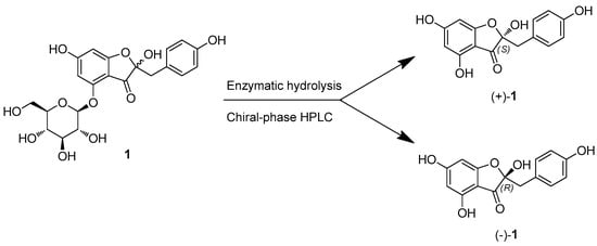 The absolute configuration of the glucose units in (+)-1 and (−)-1 was assigned using an LC/MS-UV-based method [31,32]. This was further confirmed by enzymatic hydrolysis of (+)-1 and (−)-1 using glucosidase, which yielded respective glucopyranoses. The identification of D-glucopyranose was established by comparing the retention time of its thiocarbamoyl–thiazolidine derivative with that of a standard D-glucopyranose sample [33]. The optical rotation values of the aglycones for (+)-1 and (−)-1 ( +8.0 for (+)-1a and −8.0 for (−)-1a) indicated a complete separation and an opposite relationship between (+)-1 and (−)-1. A survey of the literature revealed that compounds (+)-1 and (−)-1 were identified as previously unreported auronol glycosides, which were determined to be (2S)-hovetrichoside C [(+)-1] and (2R)-hovetrichoside C [(−)-1] by 2D NMR data (Figures S4 and S5) and comparison of optical rotation values [34].