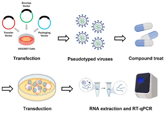 Numerous methodologies detailing the steps to generate SARS-CoV-2 pseudotyped viruses (PVs) have been made publicly available worldwide [45,46,47,48]. In our study, we employed the following approach to create PVs. We prepared a mixture of either GFP or GFP-fused Spike protein from the Omicron variant, along with an envelope and packaging vector. This mixture of plasmids was introduced into cells using Metafectene PRO (Biontex, Munich, Germany) for transfection. Subsequently, viral supernatant was collected at either 48 or 72 h intervals post transfection and stored at −80 °C (Figure 3).