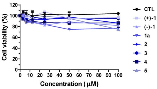 Using the pseudotyped viruses generated through the process, we evaluated the antiviral effects of the isolated compounds ((+)-1, (−)-1, and 2–5), along with compound 1a (the aglycone of (+)-1). Before conducting the antiviral assessment, we performed an MTS assay on the A549 cell line to determine the potential toxicity of the compounds. The results demonstrated that all compounds ((+)-1, (−)-1, 1a, and 2–5) exhibited cell viability exceeding 80% (Figure 4). The drug dose used in the MTS assay has been employed in various other natural compound experiments [49,50,51,52,53,54], and the confirmed dosage range falls within the working range commonly used in antiviral experiments. Based on our results, antiviral activity was demonstrated at lower concentrations (10 μM), while higher concentrations (100 μM) are sufficient to validate toxicity. This indicated that none of the compounds displayed cytotoxic effects, thus enabling us to proceed with subsequent experiments.