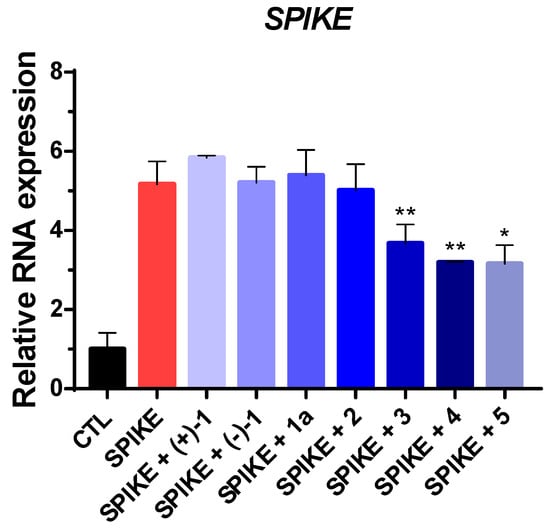 Infectivity on compounds (+)-1, (−)-1, 1a, and 2–5 (10 µM) or DMSO control (CTL) using pseudotyped virus (PV) of SARS-CoV-2 Omicron variant. Values indicate means ± SEM (n = 3, * p < 0.05, ** p < 0.01 vs. control group).