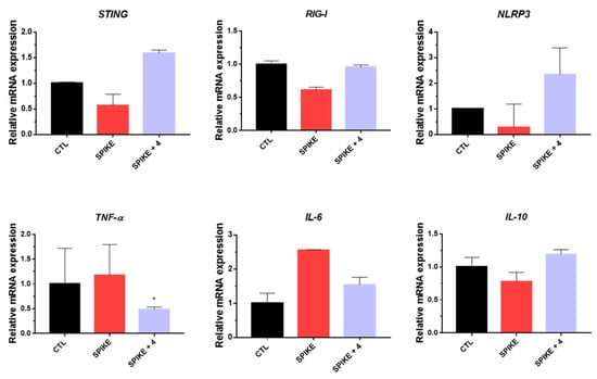 The inhibitory effects of compound 4 on SARS-CoV-2 Omicron variant pseudovirus (PV) infection in A549 cells were evaluated for STING, RIG-I, NLRP3, TNF-α, IL-6, and IL-10 genes. Values indicate means ± SEM (n = 3, * p < 0.05 vs. control group).