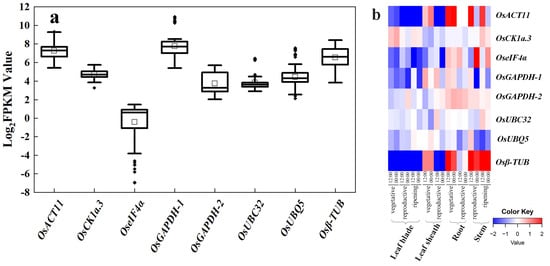 Expression profile of eight commonly used reference genes. (a) Expression displayed as Log2(FPKM) values for eight reference genes (OsACT11, OsCK1a-3, OseIF4α, OsGAPDH-1, OsGAPDH-2, OsUBC32, OsUBQ5, and Osβ-TUB) in the six RNA-seq datasets. The horizontal line in the box is the median line, the white box is the mean, and the black dot outside the box is the outlier. (b) Heatmap of expression of eight commonly used reference genes, created using data from RiceXPro (including different developmental stages and circadian time points). Blue indicates low transcript levels, and red indicates high transcript levels in log2 values.