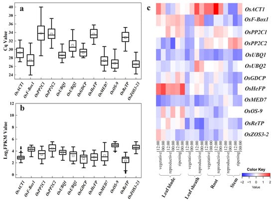 Expression profiling of the 12 candidate reference genes (OsACT1, OsF-Box1, OsPP2C1, OsPP2C2, OsUBQ1, OsUBQ2, OsGDCP, OsHeFP, OsMED7, OsOS-9, OsReTP, and OsZOS3-23). (a) The Cq values of the 12 candidate reference genes across the leaf, shoot, and root samples of rice varieties NPB and 9522 in drought and salt stress treatments. (b) The Log2(FPKM) values for each candidate reference gene in the six RNA-seq datasets. The horizontal line in the box is the median line, the white box is the mean, and the black dot outside the box is the outlier. (c) Heatmap of the expression of candidate reference genes retrieved from RiceXPro data including various tissue/organs of different developmental stages and circadian time points. Blue indicates low transcript levels, and red indicates high transcript levels in log2 value.