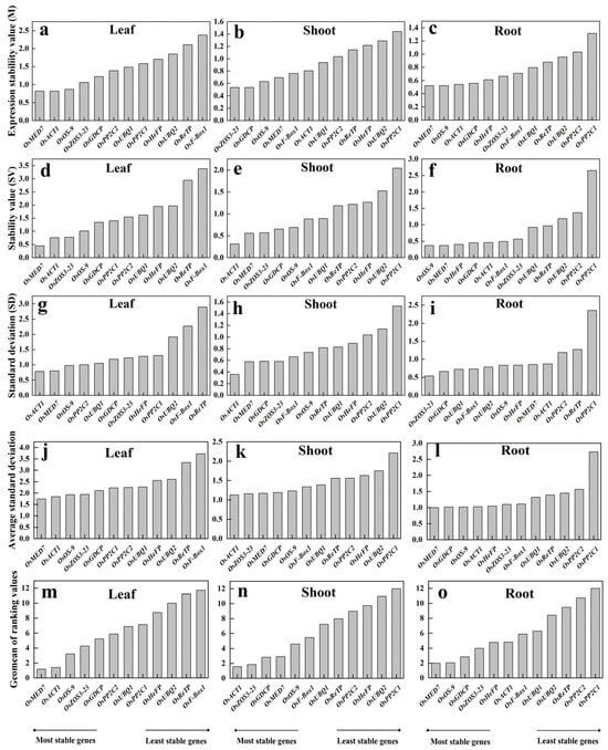 BestKeeper determines the stability of a reference gene by the extent of SD, with a higher SD value referring to low stability of the housekeeping genes and vice versa. Results from the trial samples revealed that the most stable reference genes were OsACT1 and OsMED7 in both leaf and shoot samples and OsZOS3-23 and OsGDCP in the roots (Figure 3g–i). The least stable reference genes were OsF-Box1 and OsReTP in leaves, OsUBQ2 and OsPP2C1 in shoots, and OsReTP and OsPP2C1 in the roots. The stable ones with this algorithm were the same as with the previous two methods in the leaf, with results being very different in the root or shoot.