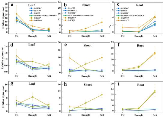 The three target genes tested in the trials are: OsbZIP71, which is sensitive to salt and drought [], OskTN80b, which is non-responsive to salt and drought [], and nitrate transporter OsNRT1.1B as a by-stander []. The results are shown in Figure 4.