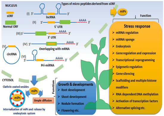 After the discovery of micropeptides, the repertoire of these fantastic small peptides has continuously been enriched with new members. Their structure, origin, and functional diversity have also regularly expanded (Figure 1). As the most widely accepted terms, peptides having 100–150 amino acids in length are considered as miPs [15]. They are derived from protein-coding or non-coding mRNA, pri-microRNA, or modification from full-length proteins having a secretary or non-secretary nature [16]. Although micropeptides can originate in diverse ways in plants and animals, they have a special open reading frame (ORF) within a genome called a short open reading frame (sORF). The sORFs are usually less than 300 bases in length [17]. This miniscule structure makes them difficult to identify with standard genomics tools. The specialized approach to identifying small transcriptomes by RNA-seq analysis, ribosome profiling (Ribo-Seq), mass spectrometry (ms), and proteogenomics applications can successfully detect miPs and their corresponding sORF [6]. The absence of AUG as a start codon in many micropeptides further obscures the identification procedure. The distinction of sORF from alternative ORF (AltORF) lies in two points: the presence or absence of AUG in sORF but the apparent presence of AUG in AltORF, and the length of the codon in sORF ranging from 10 to 100, but AltORF having a minimum of 30 codons with unrestricted upper limit [18]. This sORF can be found in long non-coding RNAs (lncRNAs), 5′ UTR or 3′ UTR of mRNA, overlapping with mRNAs, circular RNAs (circRNAs), pri-microRNA, and ribosomal RNA [19]. These molecules have diverse functions in plant growth, development, and stress responses (Figure 1). However, the detailed mechanism of micropeptides and non-coding RNAs in controlling the above functions must be deciphered (Table 1).