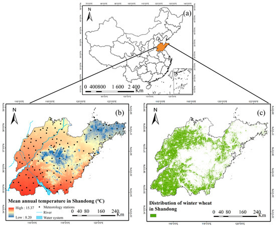 Geographical location of Shandong province, China (a), mean annual temperature and locations of meteorological stations (b), and distribution of winter wheat across the province (c).