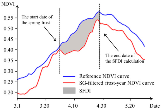 The schematic diagram of SFDI calculation. SFDI (gray shadow) is the area surrounded by the reference NDVI curve (blue) and SG-filtered frost-year NDVI curve (red) from the start of spring frost (first vertical dashed line) to the end of spring frost (second vertical dashed line). These curves were extracted from a pixel in the winter wheat planting area of northwest Shandong Province.