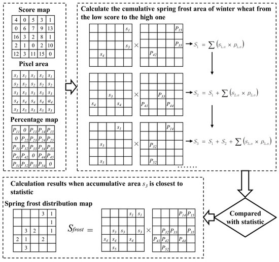 The process of the method was as follows: First, we set up a score table of SFDI. It was posited that a higher SFDI value for a pixel indicates a more severe disaster, thereby increasing the likelihood of it being a disaster area. Consequently, such pixels were assigned lower scores, ensuring their earlier inclusion in the calculation of the disaster area. The scoring rule stipulated that higher SFDI values correspond to lower scores. Based on the calculation results, all pixels with “SFDI ≥ 16” were scored as 1, all pixels with “15 ≤ SFDI < 16” were scored as 2, and so forth, until all pixels with “1 ≤ SFDI < 2” were scored as 16. The second step involved calculating the area affected by spring frost. In this step, pixels with the lowest score were selected, and their winter wheat area was calculated by multiplying the winter wheat percentage by the corresponding pixel area. Subsequently, pixels with the next lowest score were selected and added to the previous pixels. The new total area was then calculated. This process was repeated until the mapped winter wheat area closely matched the statistical area. Finally, these selected pixels represented the areas affected by spring frost in winter wheat. This process yielded a corrected winter wheat spring frost distribution map and the affected area of winter wheat.